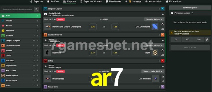 O ar7 oferece uma grande seleção de opções de apostas em e-sports com probabilidades competitivas